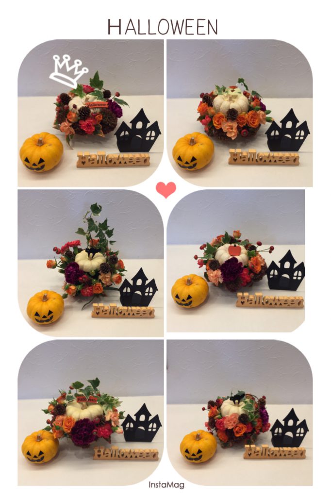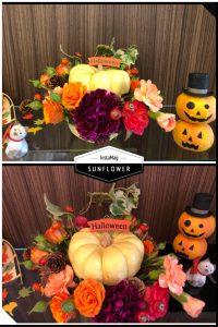 白い観賞用のかぼちゃを花器にしてアレンジ♬