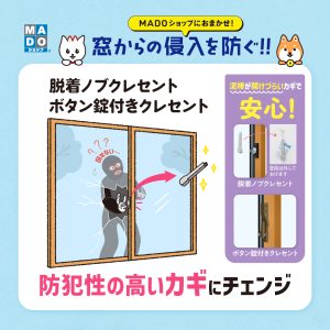 【脱着ノブクレセント】【ボタン錠付クレセント】で、開けない時は外しておけば泥棒が開けづらいカギに🔐