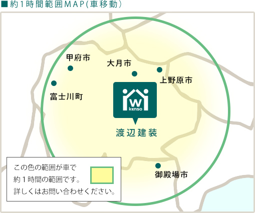 - この色の範囲が車で約1時間の範囲です。