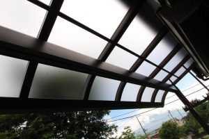 屋根材も衝撃に強い【ポリカーボネート板】で、ガラスと同程度の透明性を持ち、紫外線カットにも優れさまざまな厳しい自然条件にも優れた耐久性を発揮する素材なので、直射日光や雨風・気温などによる影響を受けにくく、また風によるバタつき音を軽減する構造になっており強風時も安全!