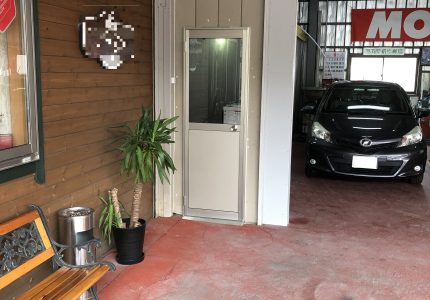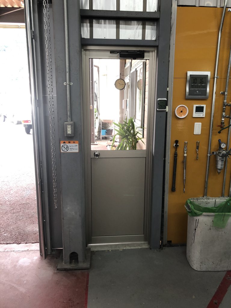 オーバースライダーを閉め作業していて、お客様がいらした際やお手洗いに行く時などこういった出入りできるドアがあると大変便利です。