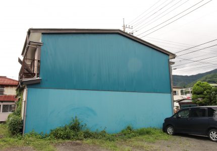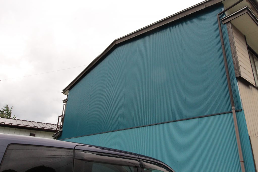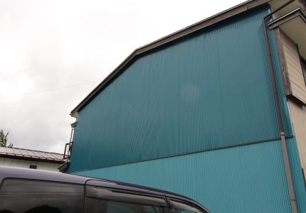 倉庫の2階部分の外壁でしたので足場を組み、既存の波板・サッシを撤去し、防水シートを入れ新しい波板を取付けました。