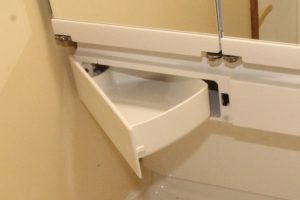 鏡は、手元に引き出せ左右開きにもできる【スウィング三面鏡】で、袖鏡が手前に引き出せるので身体を前にかがめず楽な姿勢でお化粧などもしやすい。