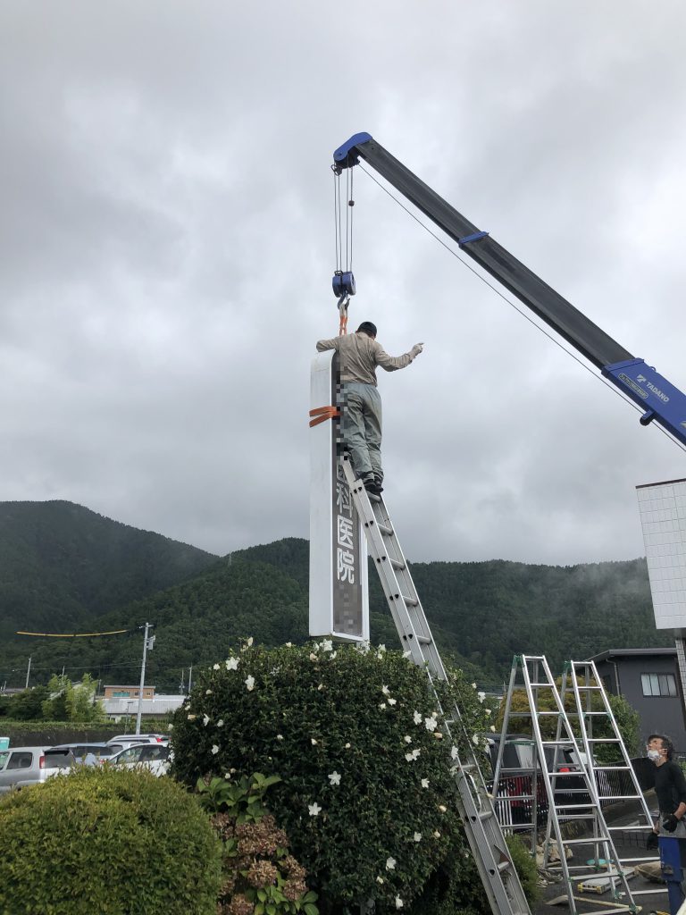 古くなった看板は倒壊や落下の恐れなどもあるので、クレーンで看板を吊りながら柱を切断し撤去させていただきました。