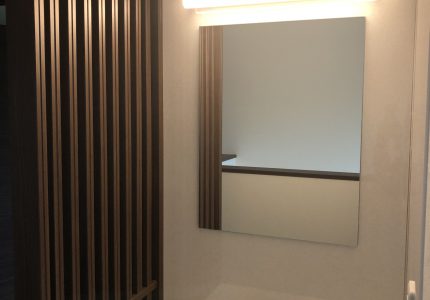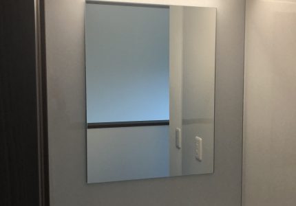ご依頼のサイズに合わせて鏡を切り出し、角を丸め安全性に配慮し設置させていただきました。