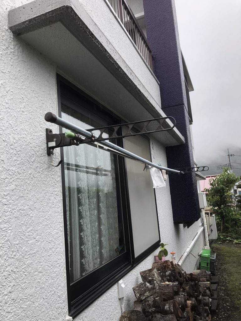 以前は壁に水平式物干しが設置されていましたが、雨戸を取付けたことで使用できなくなってしまったので、天井付けの物干しに変え以前同様に洗濯物を干せるようにしました。