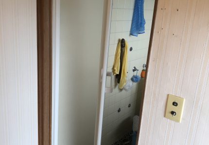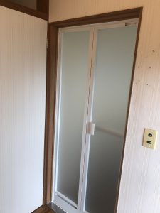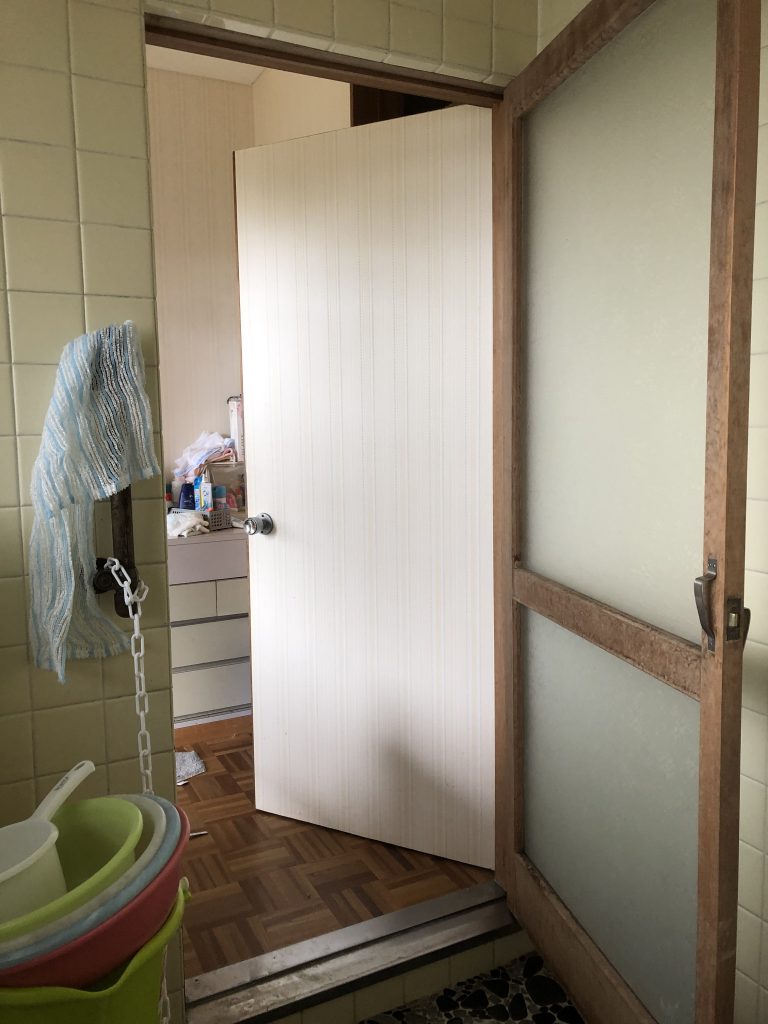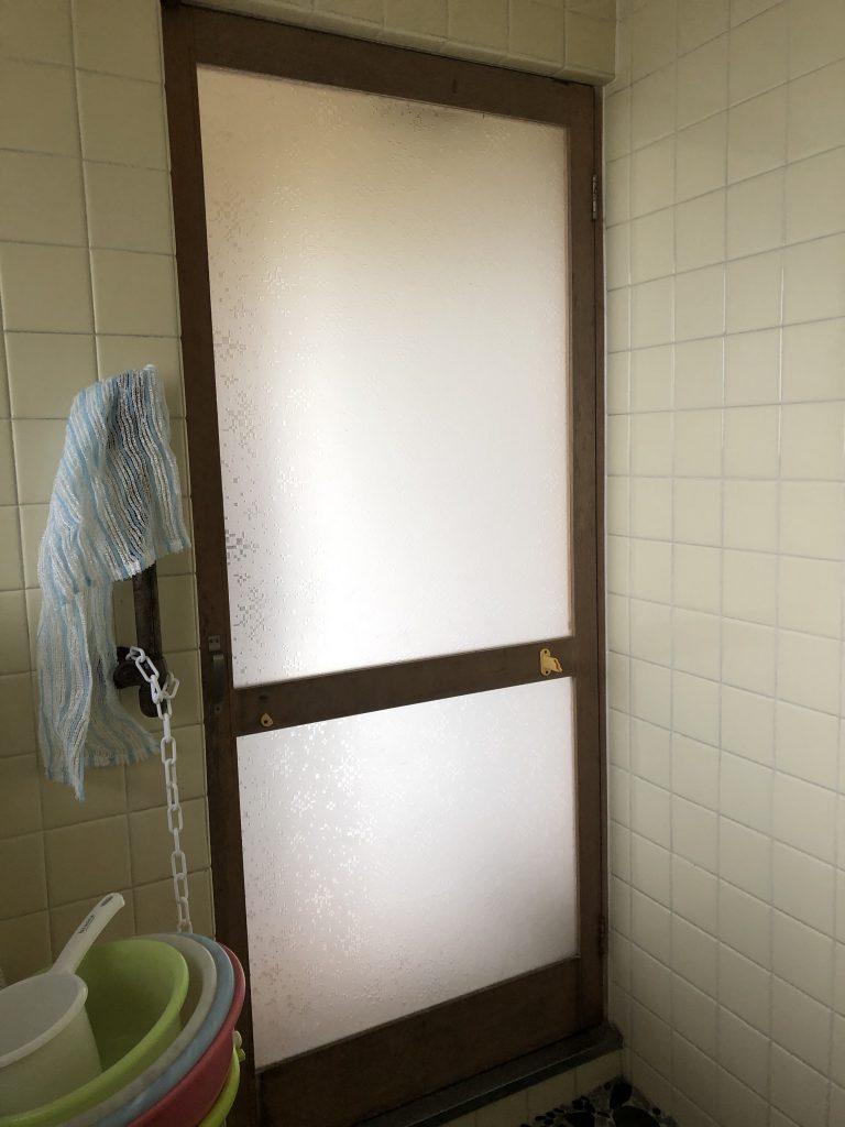浴室ドアが木製ドアで、水染みなどがあり開閉にも不具合があるので新しくしたいとご依頼いただきました。
