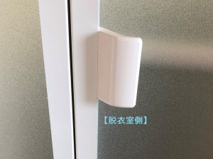 折戸の面材部は“ポリスチレン樹脂板”で割れても破片が飛散しにくく、また幼児が誤って浴槽に落ちるなどの事故を防ぐために、浴室側と脱衣場側から施解錠可能な【チャイルドロック】が取付けてあり安全性に配慮しています。
