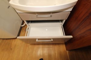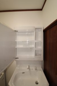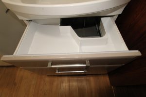 キャビネットは「2段スライドタイプ」を採用し収納物が見やすく出し入れしやすく、ミラー裏やミラー横にもたっぷり収納棚で、ミラー裏には便利な小物ラックとコンセントがついているのでスッキリ収納できます!