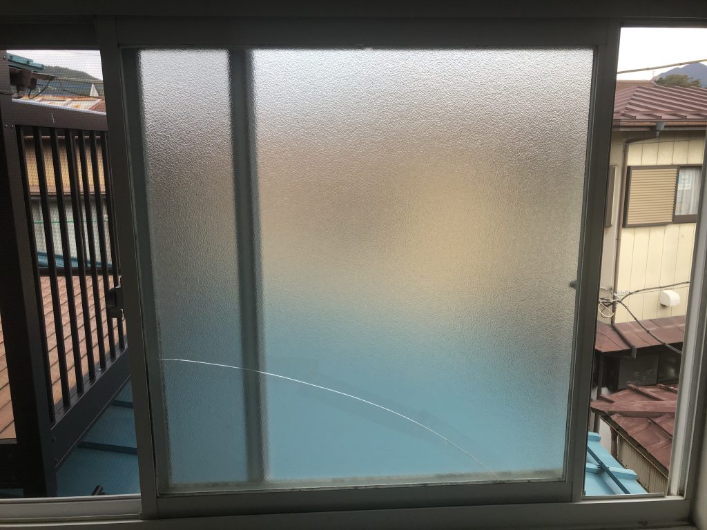 寸法を測り「型ガラス」を切り出し、窓枠から外しサッシと既存のヒビが入っているガラスを外します。