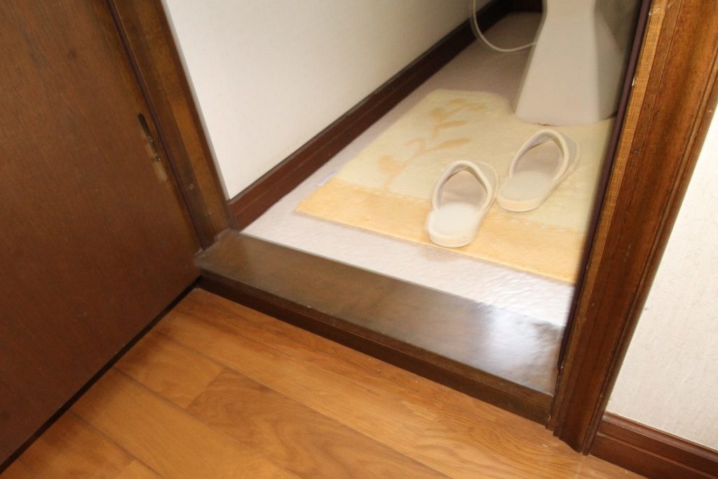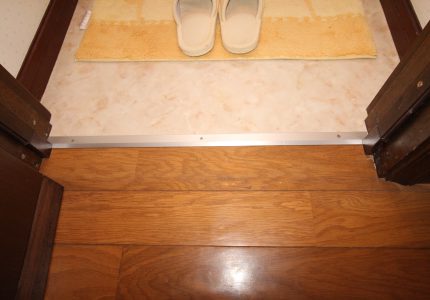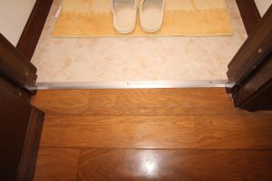 またちょっとした段差でもつまづて転んでしまう危険性がありますので、敷居を撤去させていただき、クッションフロアが捲かれてこないよう【への字押さえ】で対策を行いました。
