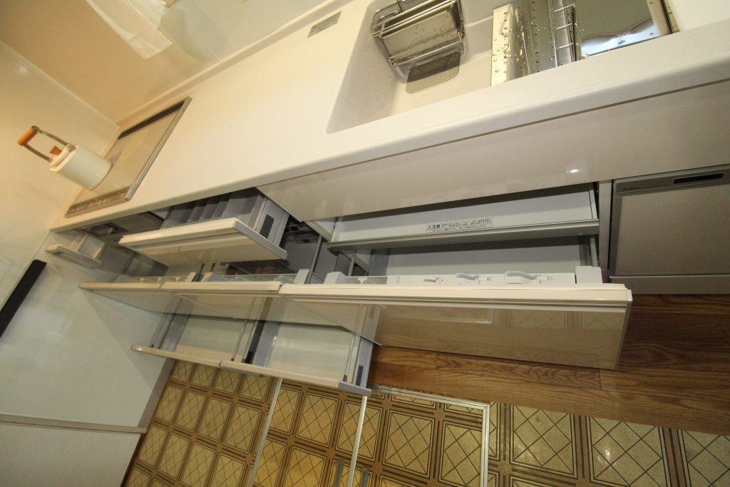 キャビネットの引出しが多層構造になっており、たっぷり収納でき取り出しやすく、調理の効率も上がります!