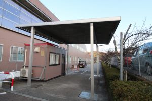 雨や雪が降った際でも濡れずに検査がスムーズに行えるように、YKK AP『ジーポートneo』を施工させていただきました。