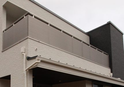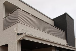 床支持タイプで支柱の外側に格子が取り付く納まりなので面の一体感を出すことができ、細身の【横ストライプ】格子が、シャープな印象を与え水平ラインが強調され伸びやかなデザインで、下からの視線をしっかり遮りプライバシーを守ります!