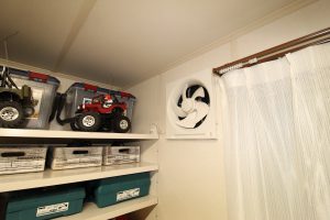 物置内には収納棚を設置し、趣味で使用するものや季節ものの家電などをスッキリ収納できます。