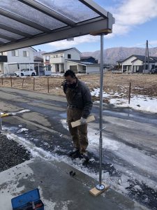 万が一、車がぶつかることを想定し柱を埋めない方法でテラス屋根を設置していたので、鴨居ジャッキを使用し屋根を支えて曲がってしまった柱を外し、YKK AP『ソラリア テラス屋根「柱」』で交換させていただきました。