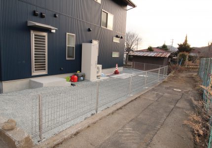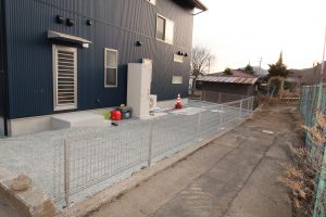 敷地境界や隣の土地との高さがあるので、YKK AP『イーネットフェンス A1F型』を設置させていただきました。