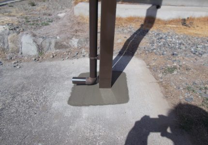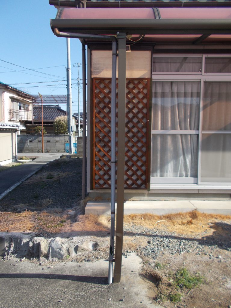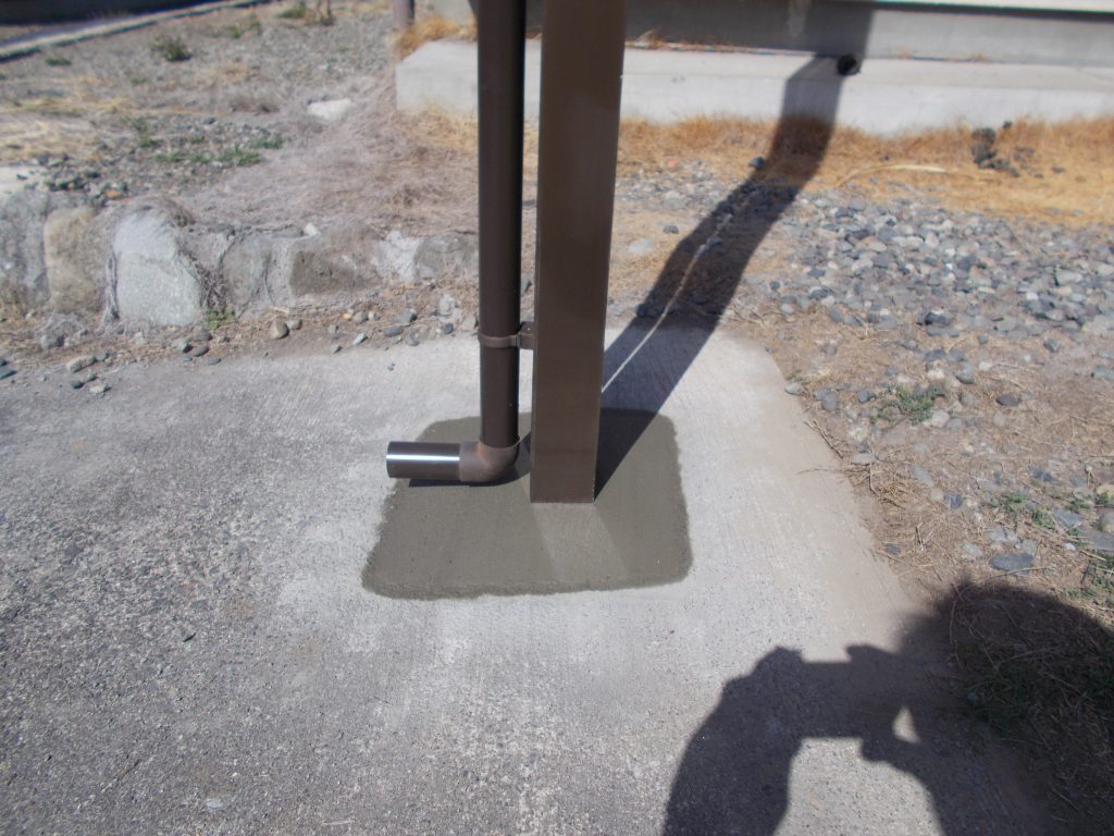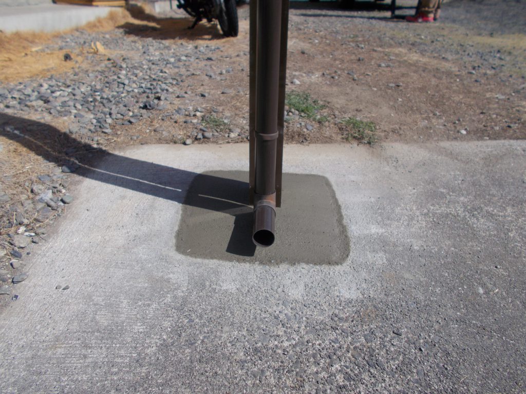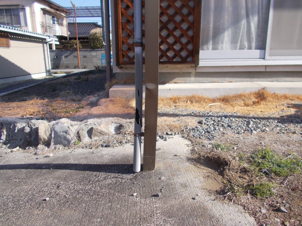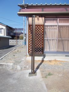 柱が埋め込まれていたので、“鴨居ジャッキ”を使用し屋根を支えてコンクリートを斫り、三協アルミ『テラス屋根補修部材「柱」「雨樋」』を交換させていただきました。