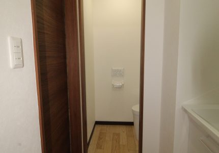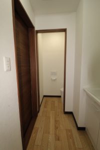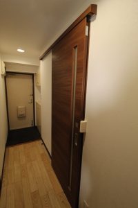 もともとトイレと脱衣場のドアが別々にありましたが、出入りできるドアを一箇所にし、脱衣場のドアをYKK AP『ラフォレスタ アウトセット引戸』へ変えさせていただきました。