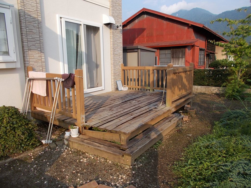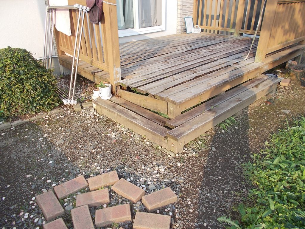 長年に渡り風雨に晒されて朽ちてしまったウッドデッキ。