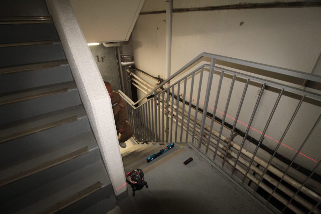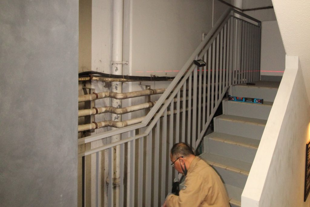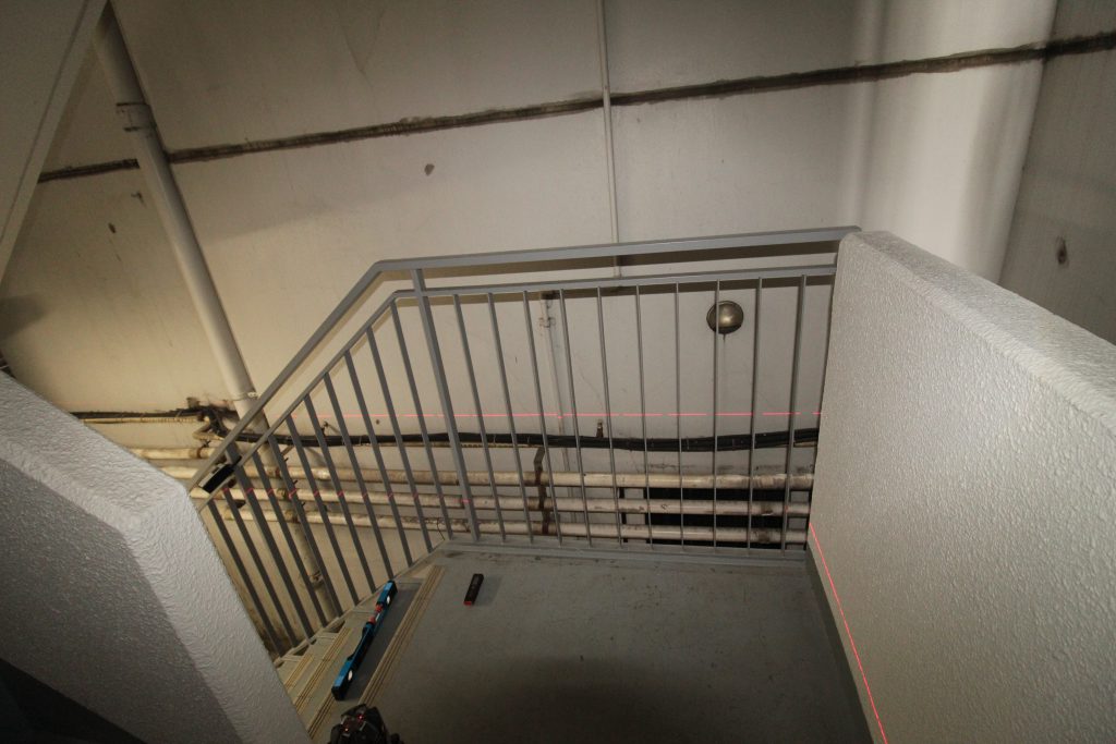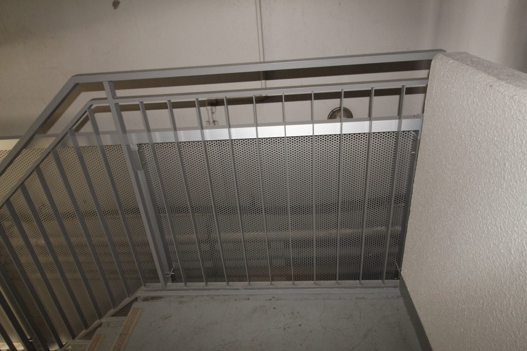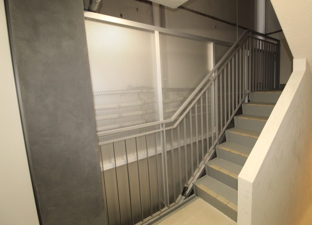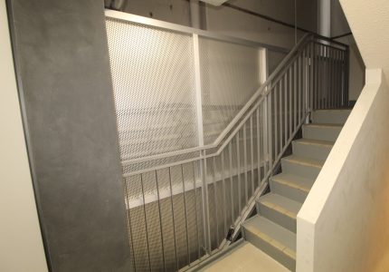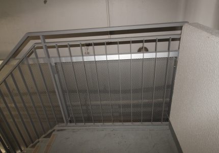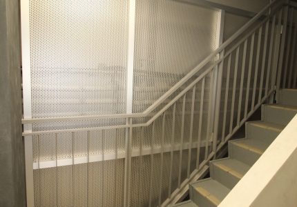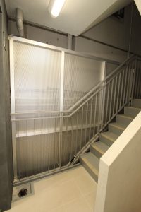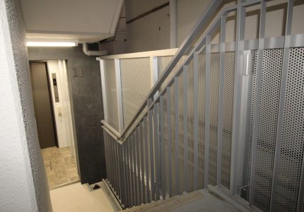 柱材は「アルミ製」なのでサビなどに強くキレイな状態を保て、「パンチングパネル」は穴があいているパネルなので軽量化を図れるほか通風性に優れ、階段を上る際隣のビルの配管などが程よく遮られます!