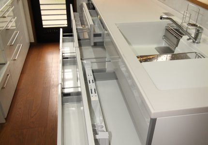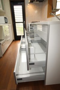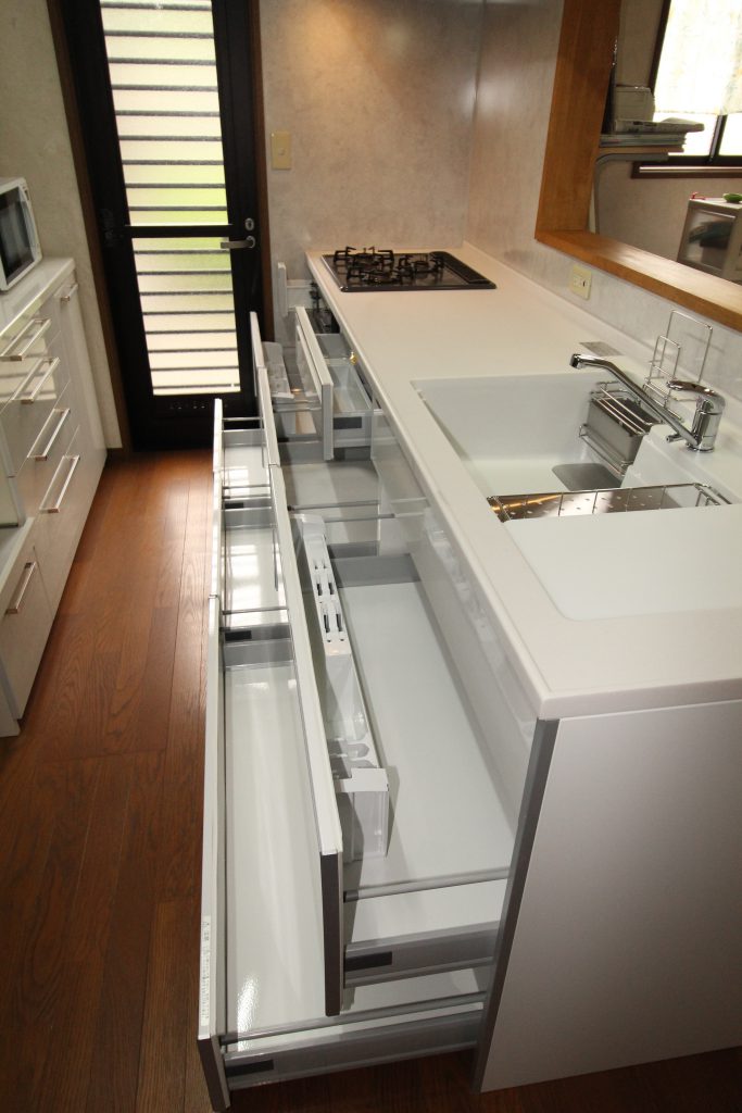 キャビネットの引出しが多層構造になっており、たっぷり収納でき取り出しやすく、調理の効率も上がります!