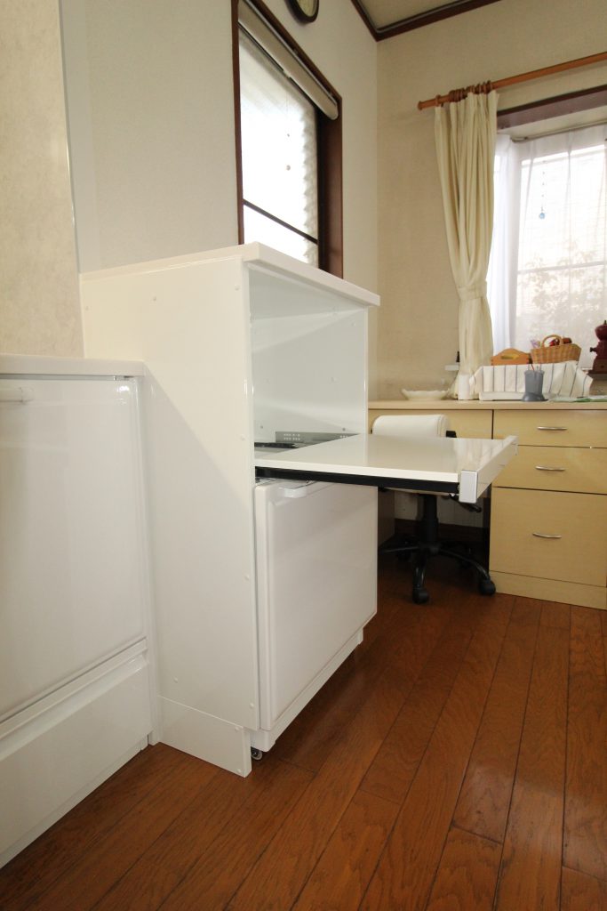 また『家電収納ユニット(収納ワゴン付タイプ)』も設置し、調理家電製品やキッチンまわりで置き場所に困るダストボックスもスッキリ収納できます。
