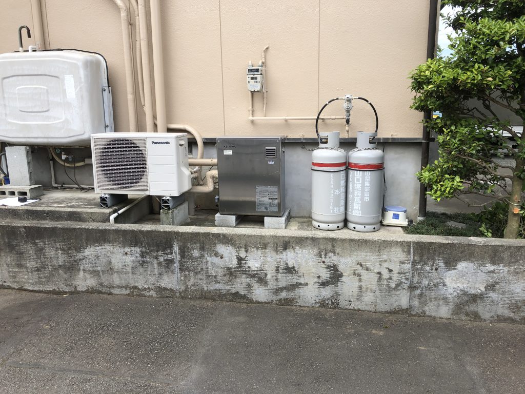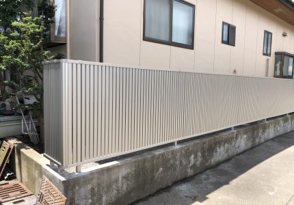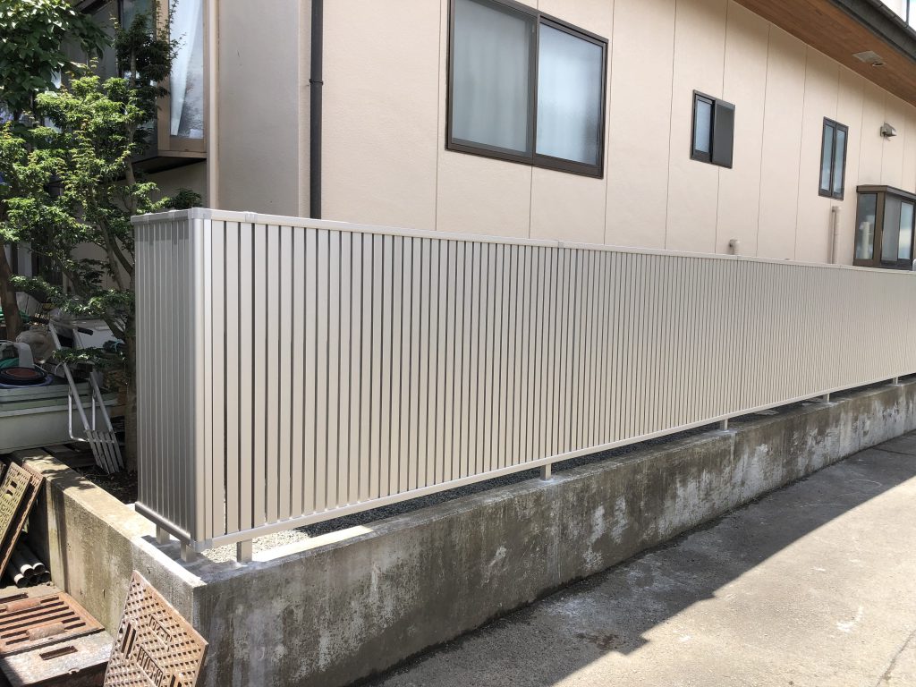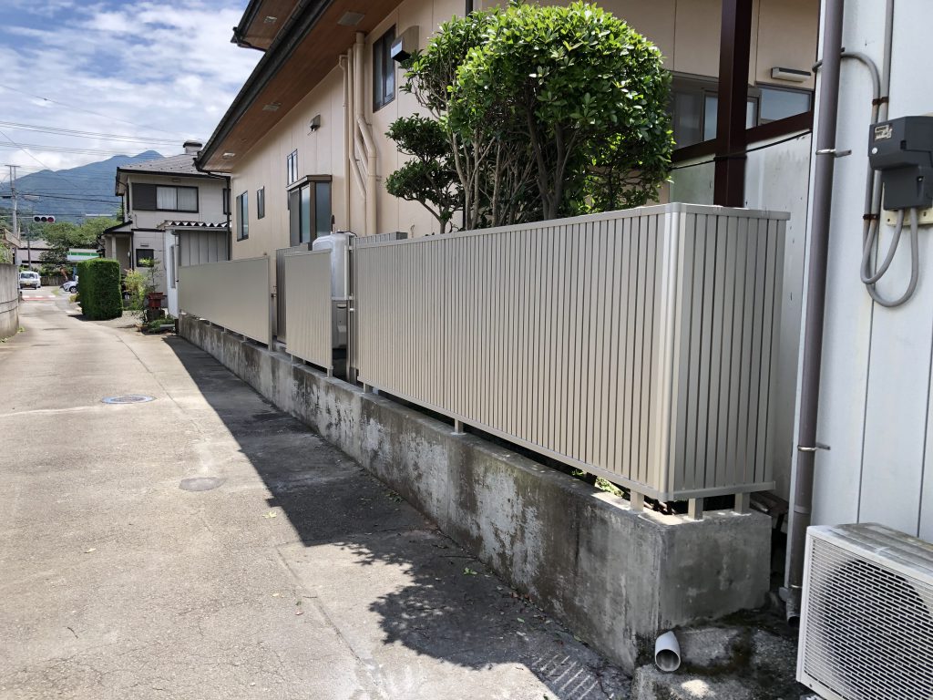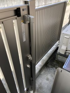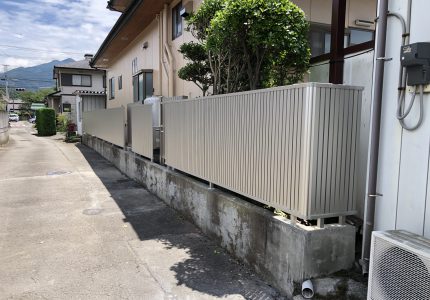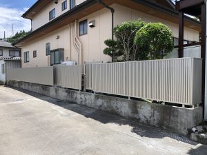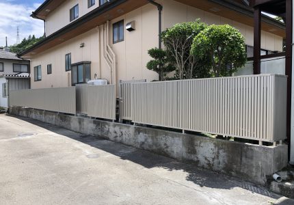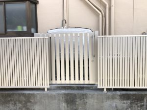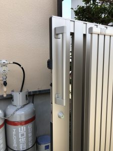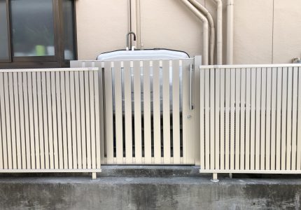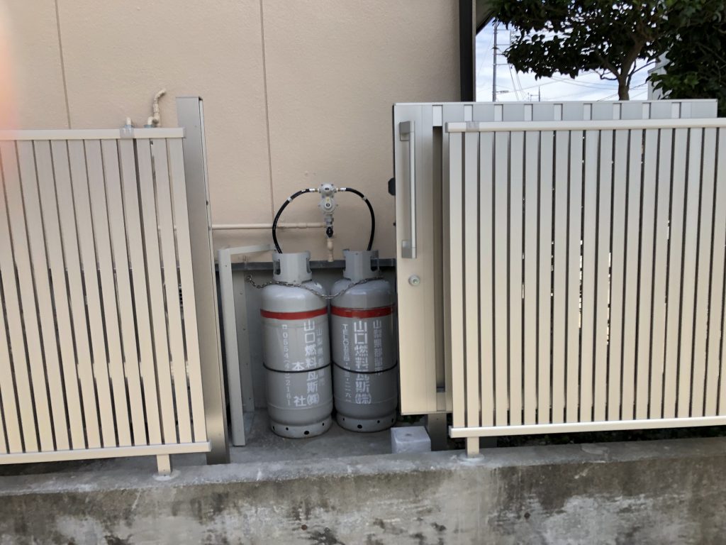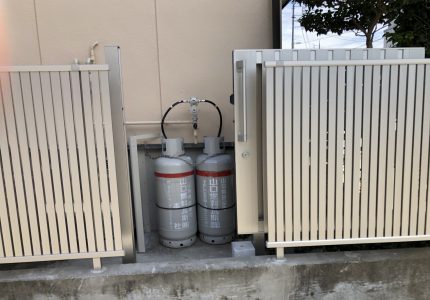 フェンスはYKK AP『シンプレオフェンス 4型』、ガスボンベ・石油タンクの場所にはYKK AP『ルシアス スライド門扉 SO2型』を取付けさせていただきました。