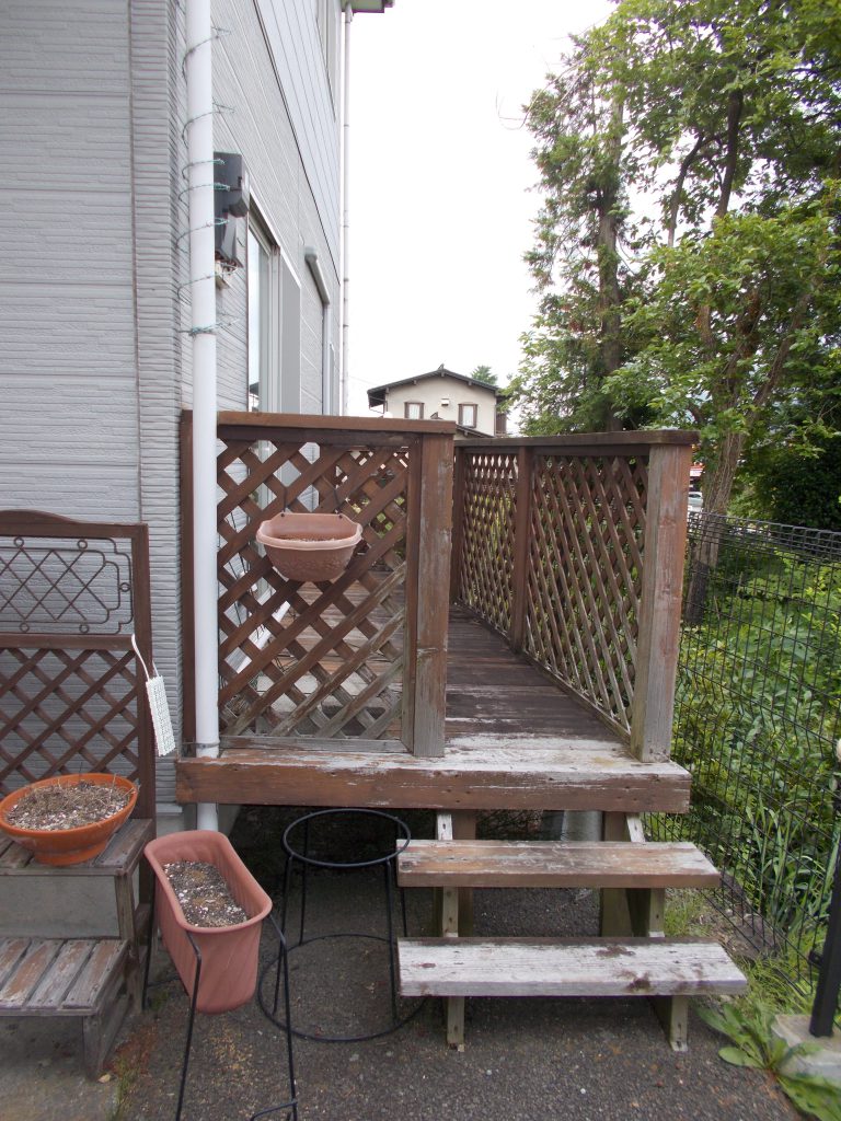 既存の木製デッキが腐ってきていて危ないので、屋根を取付けて雨が降っても洗濯物が濡れない場所にしたいとご依頼いただきました。