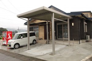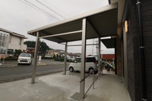 コンクリートで基礎をしっかり固め、頑丈なスチール折板の屋根を太い4本の柱でしっかり支えており、安定感のあるカーポートになりました。