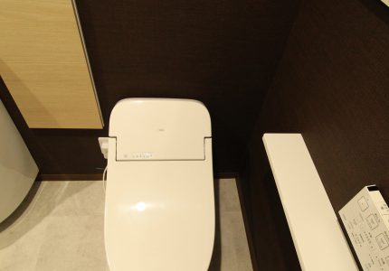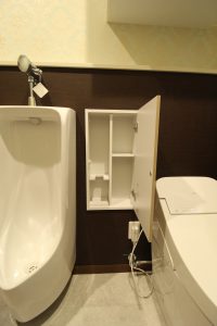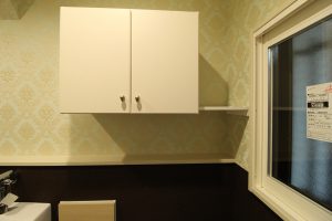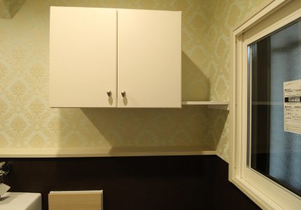 収納には、TOTO『フロア収納キャビネット』とTOTO『背面ウォール収納キャビネット』を取付けさせていただきました。
