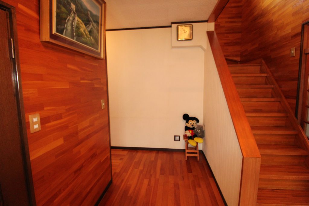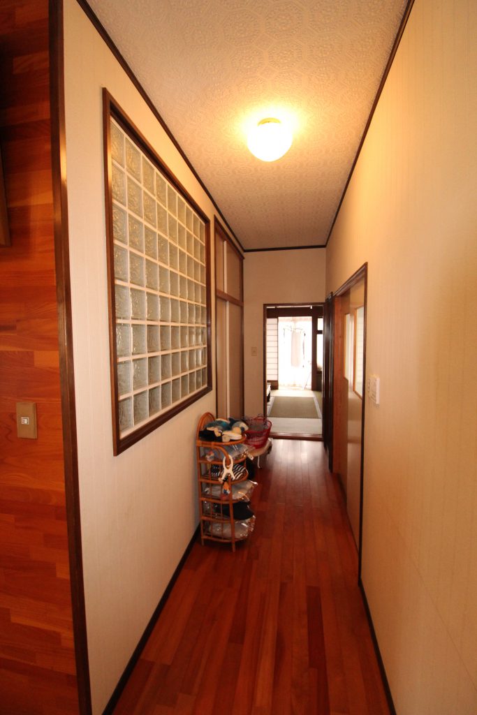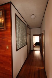 廊下の壁紙には、サンゲツ『キズがつきにくい壁紙』の少し柄を感じるラグジュアリーな雰囲気のクロスを採用しました。