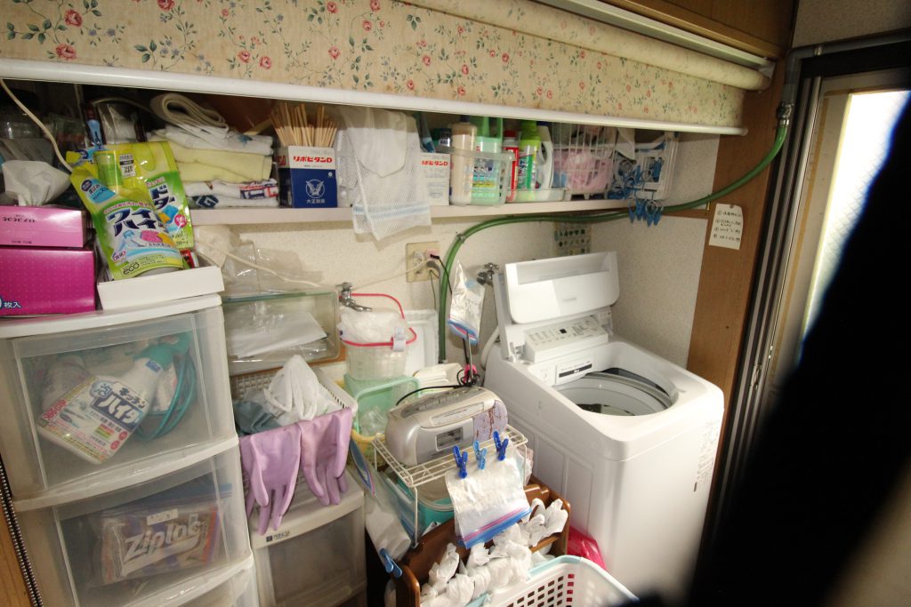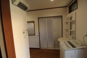キッチン後ろにある物入の壁を取り除き脱衣場とキッチンを繋げ、脱衣場からキッチンへも勝手口へも行き来がしやすくなりました。