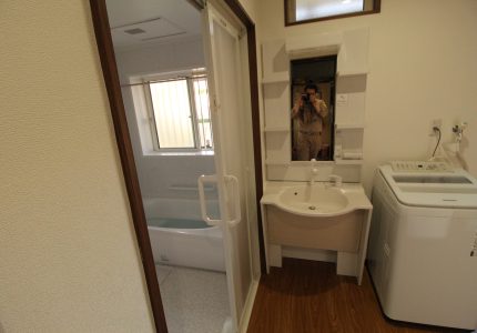 車いすを使用しているご家族、介助や同居するご家族にも使いやすい洗面化粧台です。