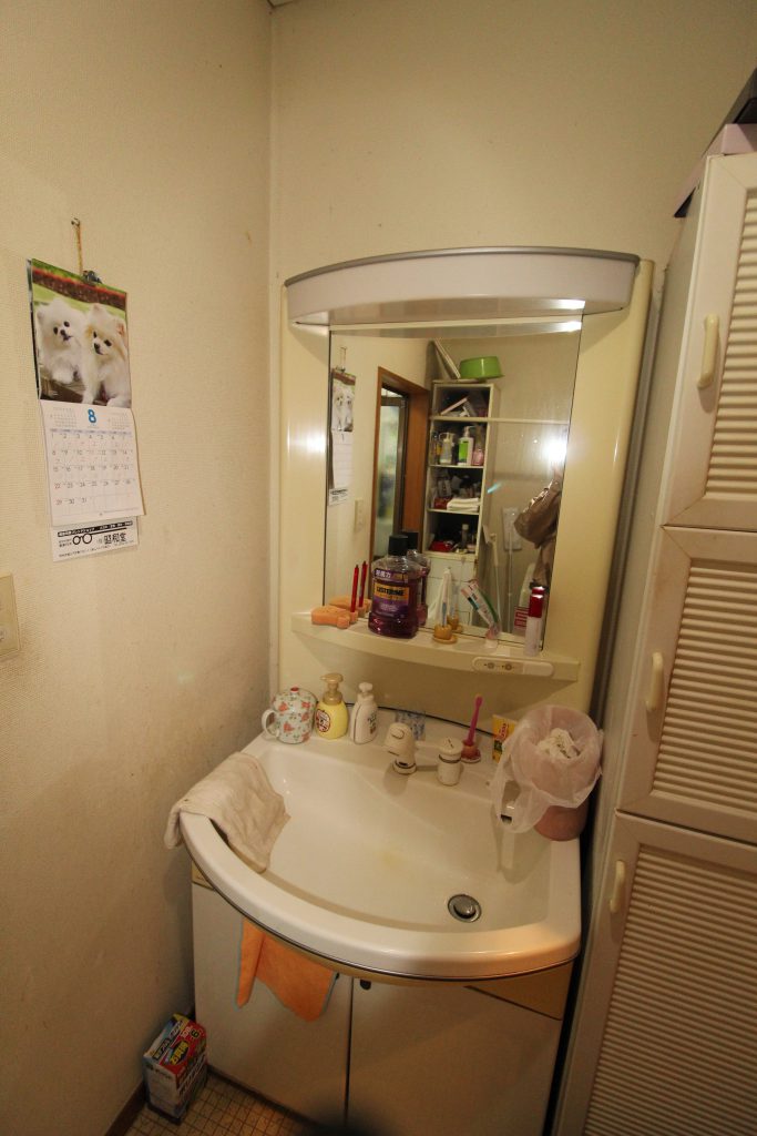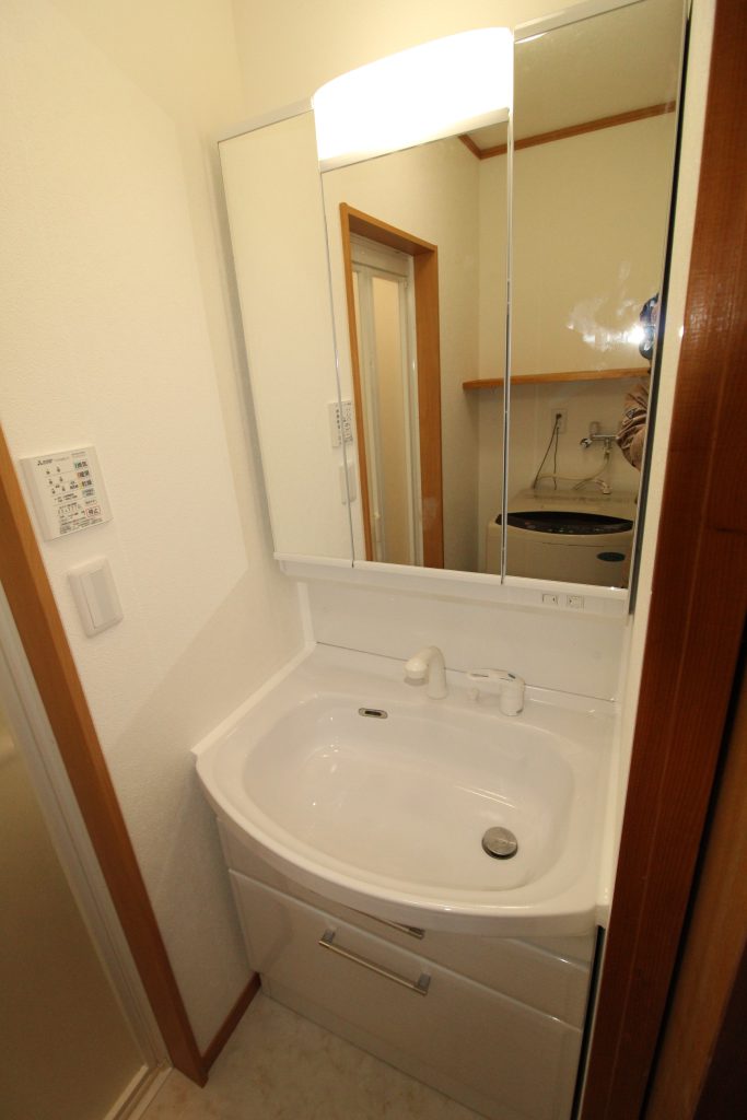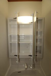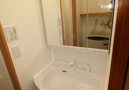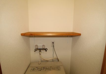 洗面化粧台も新しくし、洗濯機の上に物を置ける棚を取付けたいとご依頼いただきました。