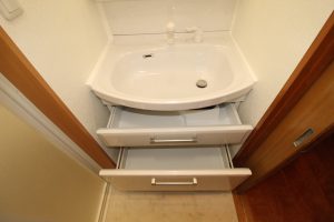 キャビネットのすみずみまで水まわりに最適な「高品位ホーロー」なので、お手入れカンタンで丈夫、いつまでもキレイで長く使える洗面化粧台です!