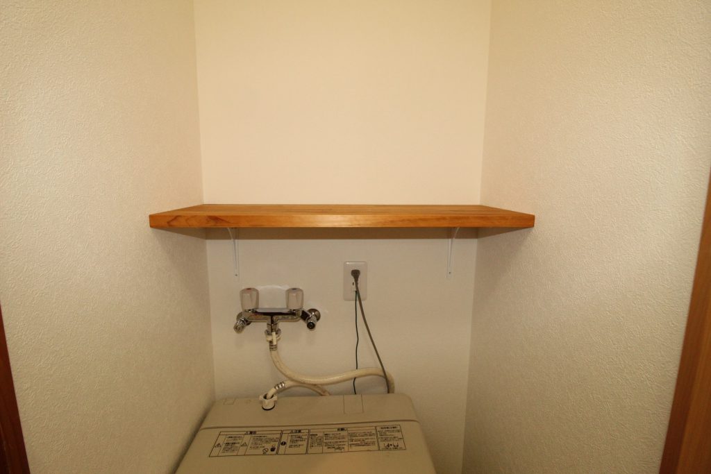 洗濯機上の棚を作り洗剤や物が置けるようにし使い勝手を良くし、洗濯機への水栓や給水栓は万が一外れてしまっても水が出ないもの、排水トラップもニオイが上がってこないよう専用のものへ交換しました。