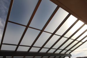 屋根材は【熱線遮断ポリカーボネート板】を採用し、アクリル板に比べ約20倍衝撃に強く、弾力性に富んだ材質で熱による屋根下温度の上昇を防ぎ、紫外線・赤外線カットにも優れています。