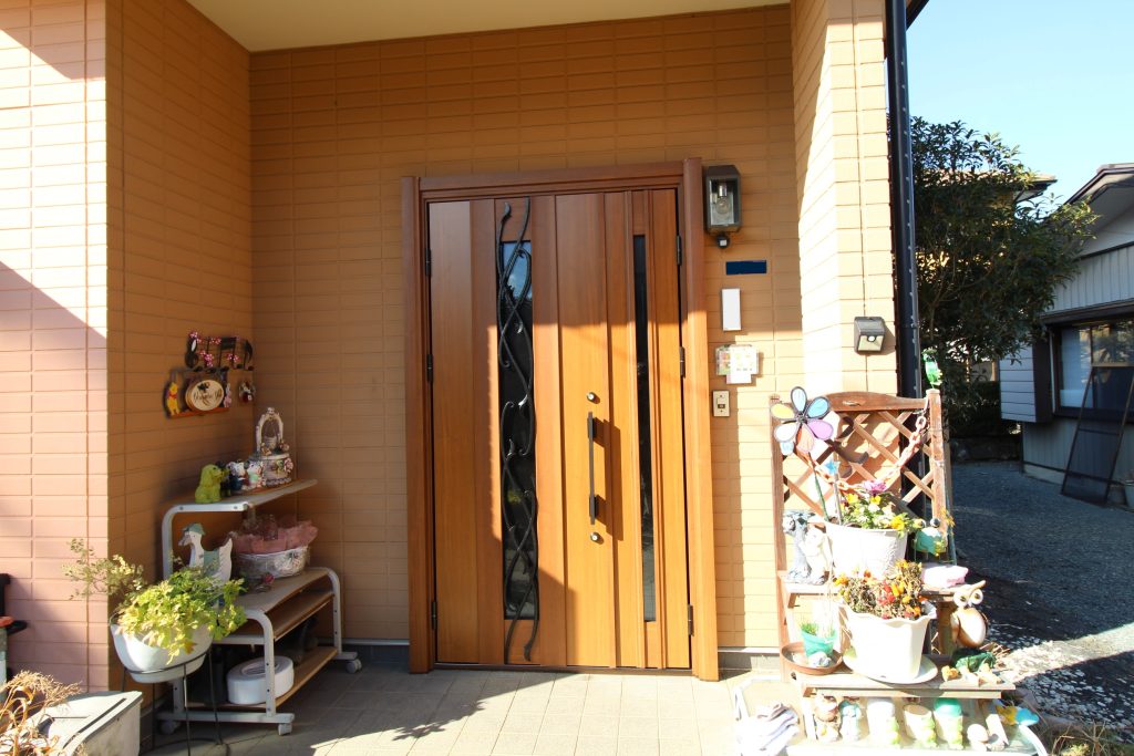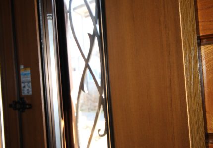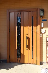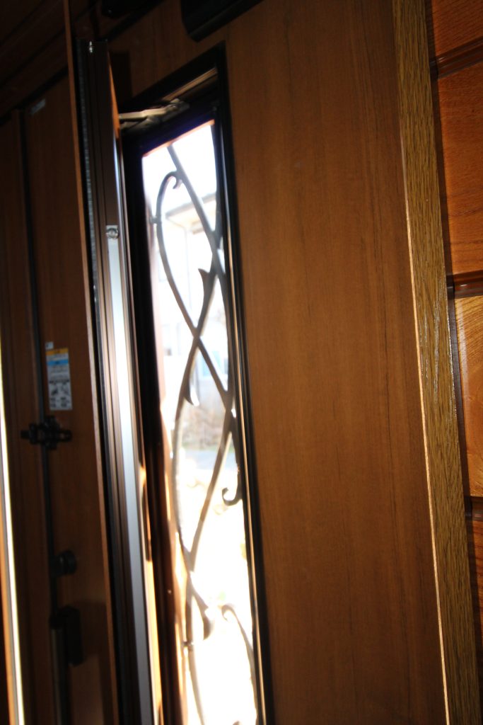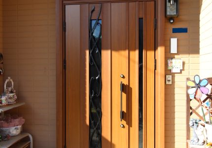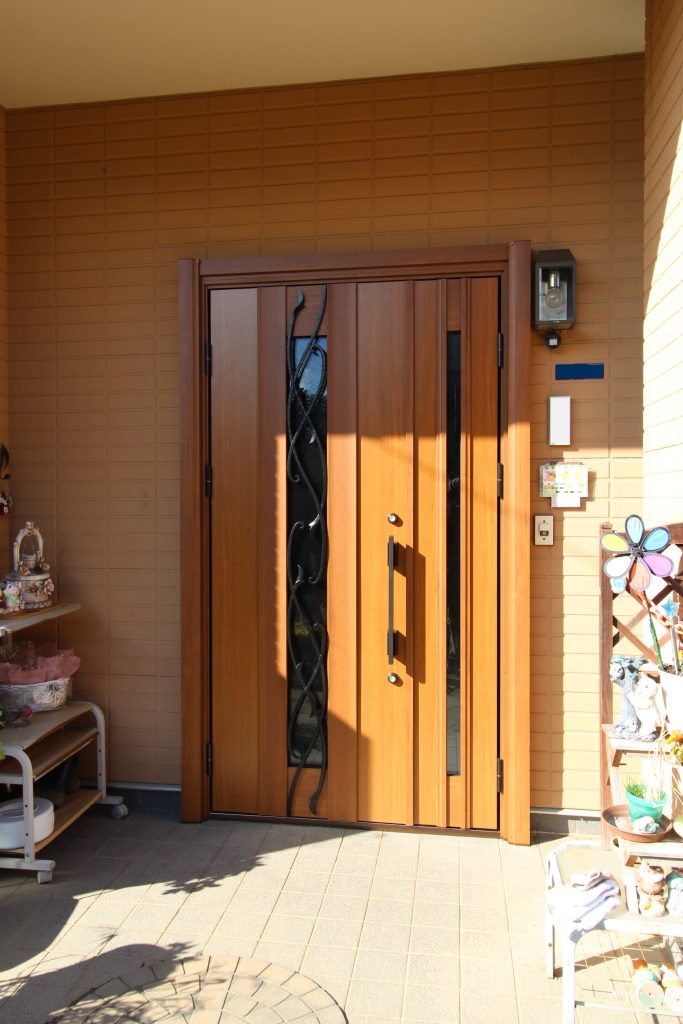 ロートアイアン調の唐草装飾でオシャレで、木目調で明るく優しい印象の玄関になりました。