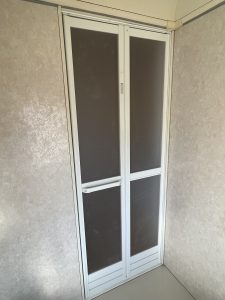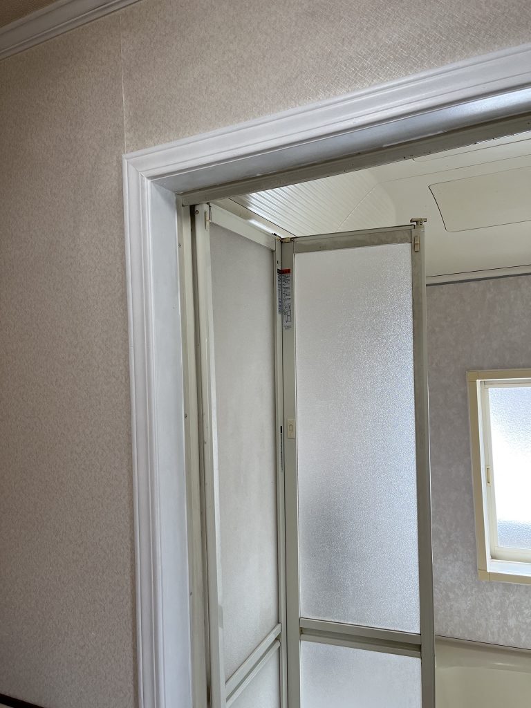 浴室の扉が壊れてしまい閉めることができないので、どうにかしてほしいとご依頼いただきました。