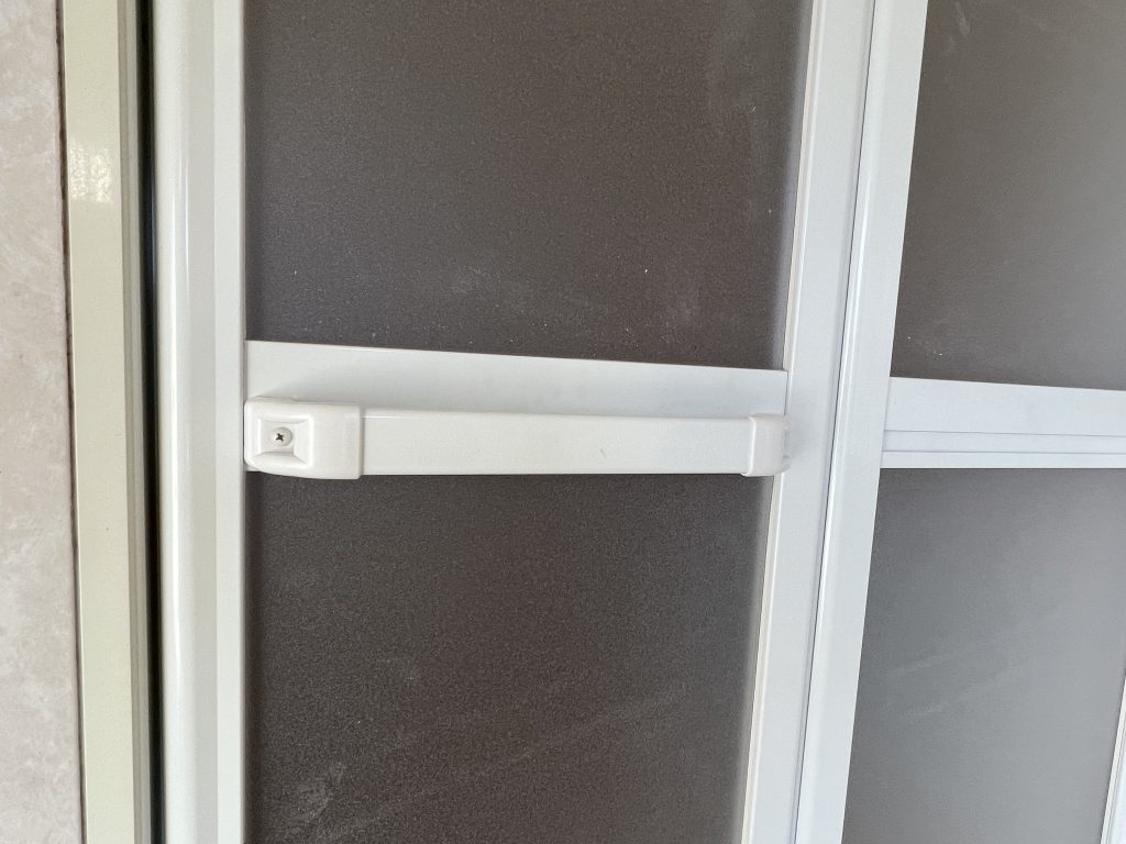 面材部には、割れても破片が飛散しにくいポリスチレン樹脂板を採用、万が一浴室内で事故が発生したときに脱衣室側から脱着レバーを押し下げることで扉が外すことができたり、浴室側・脱衣室側から施解錠可能チャイルドロックがついているので、とても安全性に配慮されています。