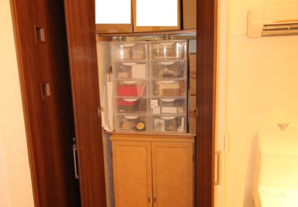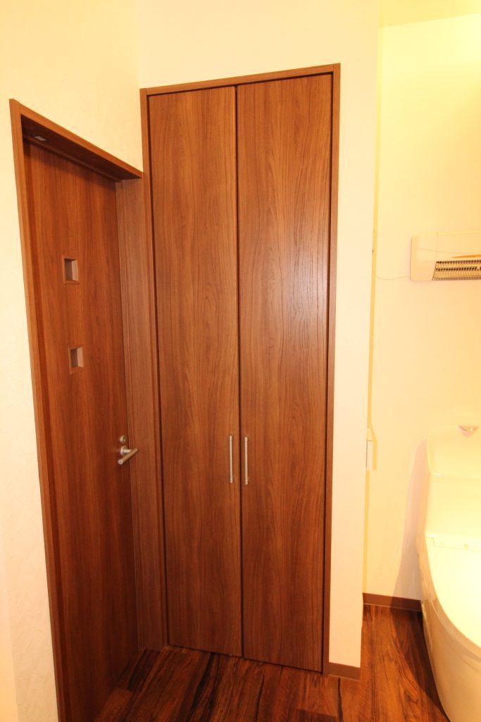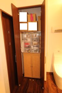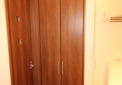 弊社、住まいのリフォーム館で使用するスリッパなどを収納する納戸を作り、YKK AP『木製インテリア建材 ラフォレスタ クローゼットドア(開き戸タイプ)』を取付ました。