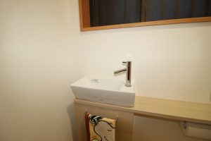 手洗器はシャープなエッジですっきりとした角デザインの【ベッセルタイプ】、水栓は【ハンドル式水栓】を採用しました。