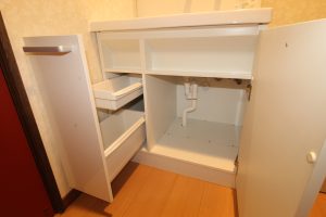 キャビネットは、出し入れしやすい引き出しと大きな物が入る広いスペースの扉タイプの組み合わせた【片引き出し】を採用し、配水管のカタチをシンプルにし奥に配置することで広い収納スペースを確保できます!