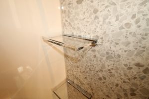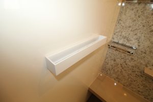 アクリル人造大理石でできた【ボウル一体型カウンター】は、機能性を追求した使い勝手の良い形状で、水栓の出っ張りを抑えコンパクトなので洗顔時の姿勢もラクラク。