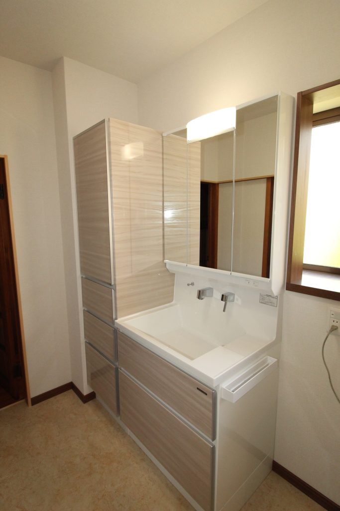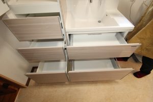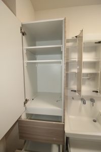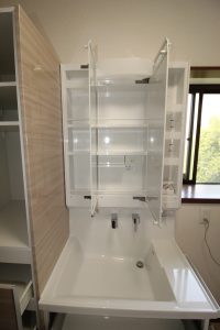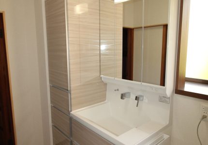 洗面化粧台を新しくし、収納も取り付けたいとご依頼いただきました。