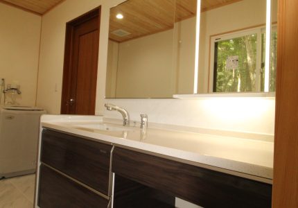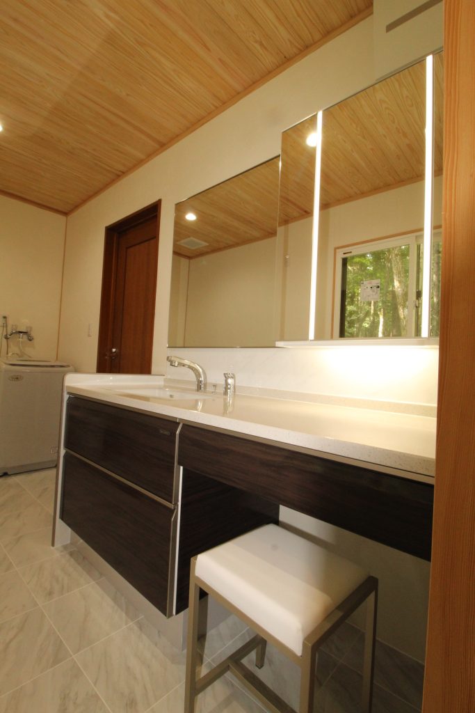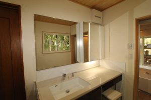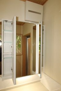 鏡は「フェイスクリアミラー」を採用し、縦型の高演色タイプのLED照明で、顔に影が出来ないからメイクアップにオススメ!