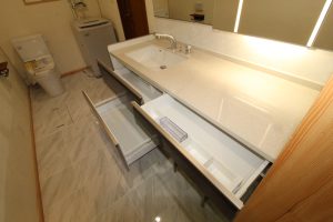 キャビネットは使い勝手の良いスライド収納なので、奥まで収納物の出し入れがラクラク。