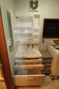 浴室はタイルなので寒く感じ、浴室をリフォームするなら脱衣場も一緒にキレイし洗面化粧台を変えたい。