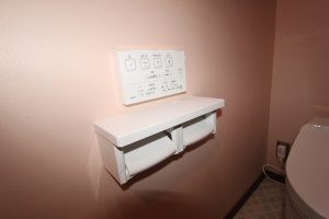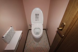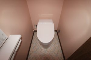 レストルームは、ピンクを基調としたクロスやかわいい柄のクッションフロアへ変え、雰囲気をガラリと変えました!